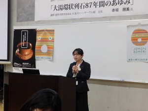 第2回は、一戸町教育委員会の菅野紀子先生と、鹿角市教育委員会の赤坂朋美先生をお招きし、菅野先生には「土屋根住居のある風景-御所野遺跡」、赤坂先生には、「大湯環状列石87年間のあゆみ」と題してそれぞれお話しいただきました。